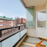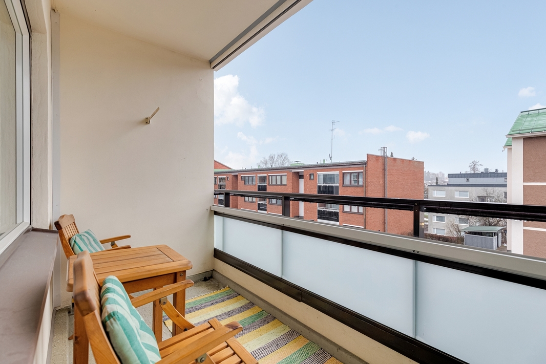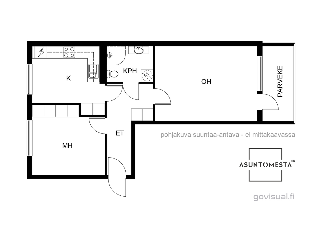 Läpitalon huoneisto, jossa keittiö ja makuuhuone sijoittuu pihan puolelle ja olohuone sekä parveke ilta-aurinkoon.