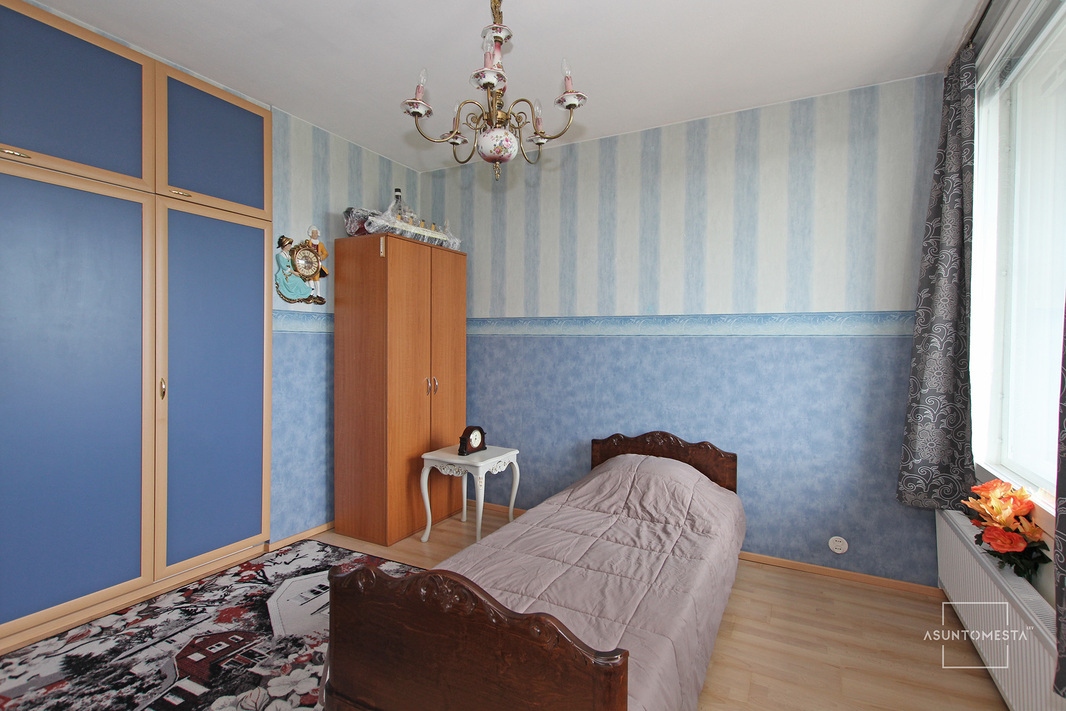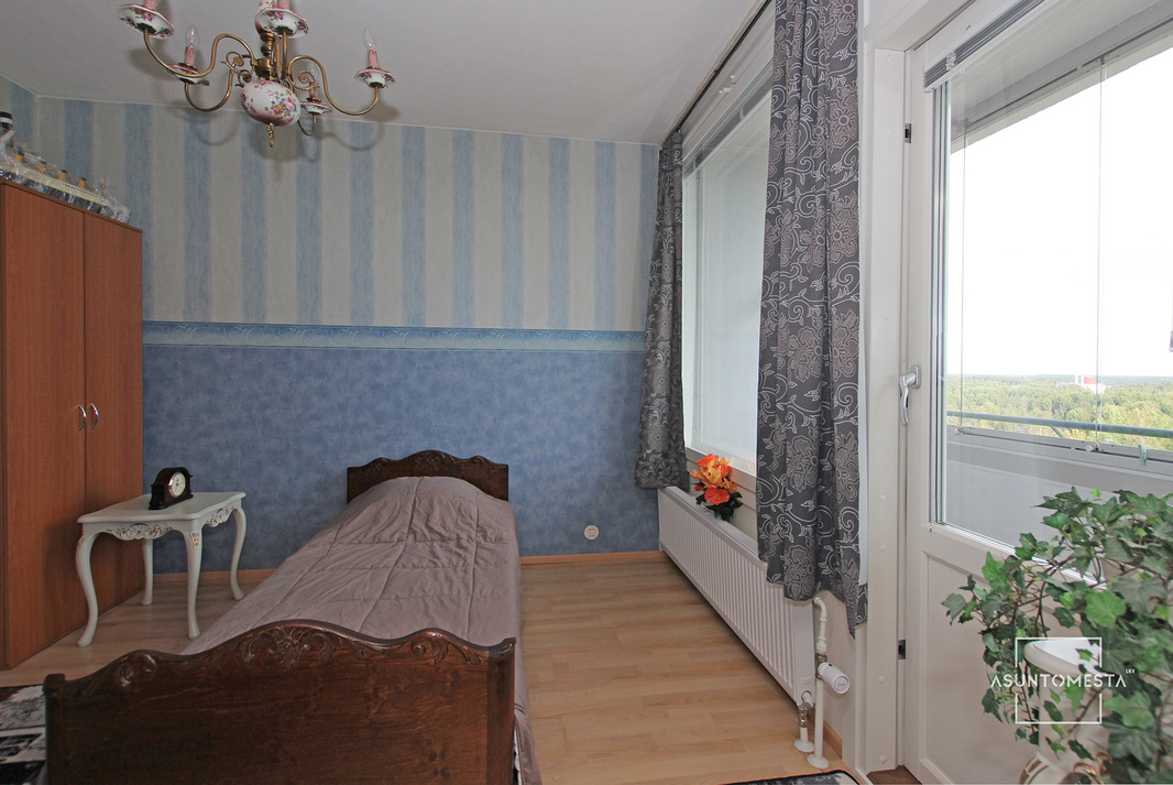 Tässä kulmahuoneistossa riittää luonnonvaloa ja verhoja ei arvatenkaa tarvita, ainakaan näkösuojaksi. Kylpyhuone on viime vuonna 2025 remontoitu ja taloyhtiössä tehty mittavia uudistuksia. Huoneet on mukavan tilavat ja säilytystilaakin löytyy monista kaapeista.