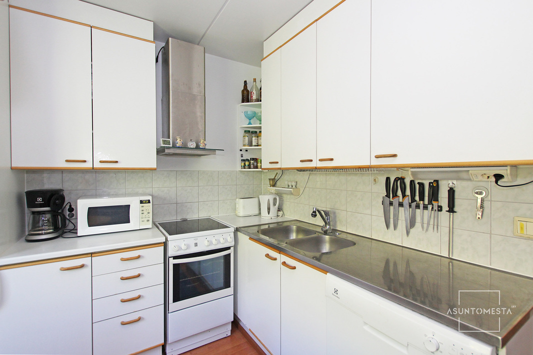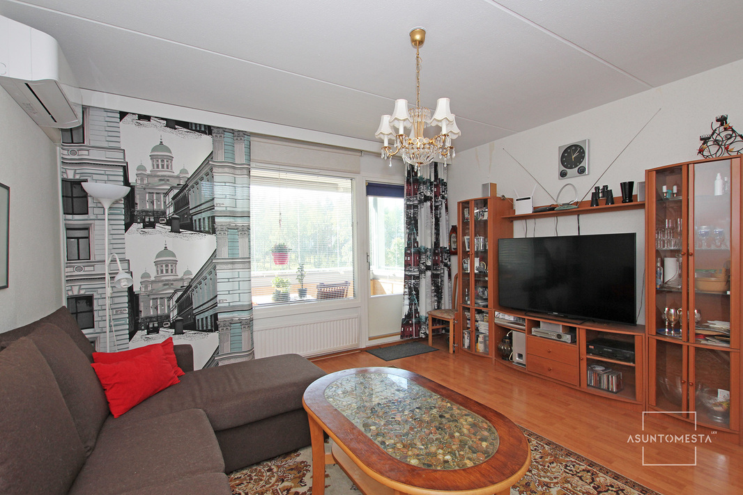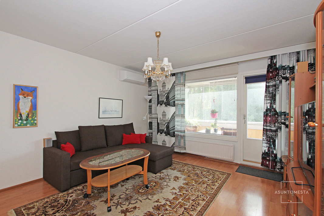 Huoneiston neliöt on jakautunut toimivasti: erillinen keittiö, todella hyvän kokoinen makuuhuone ja tilava olohuone, josta käynti lasitetulle parvekkeelle.