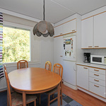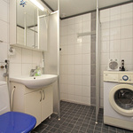 Kylpyhuone on laatoitettu ja tilaa on myös pesukoneelle. Säilytyksestä pitää huolen vaatehuone, ja kaapistot.
