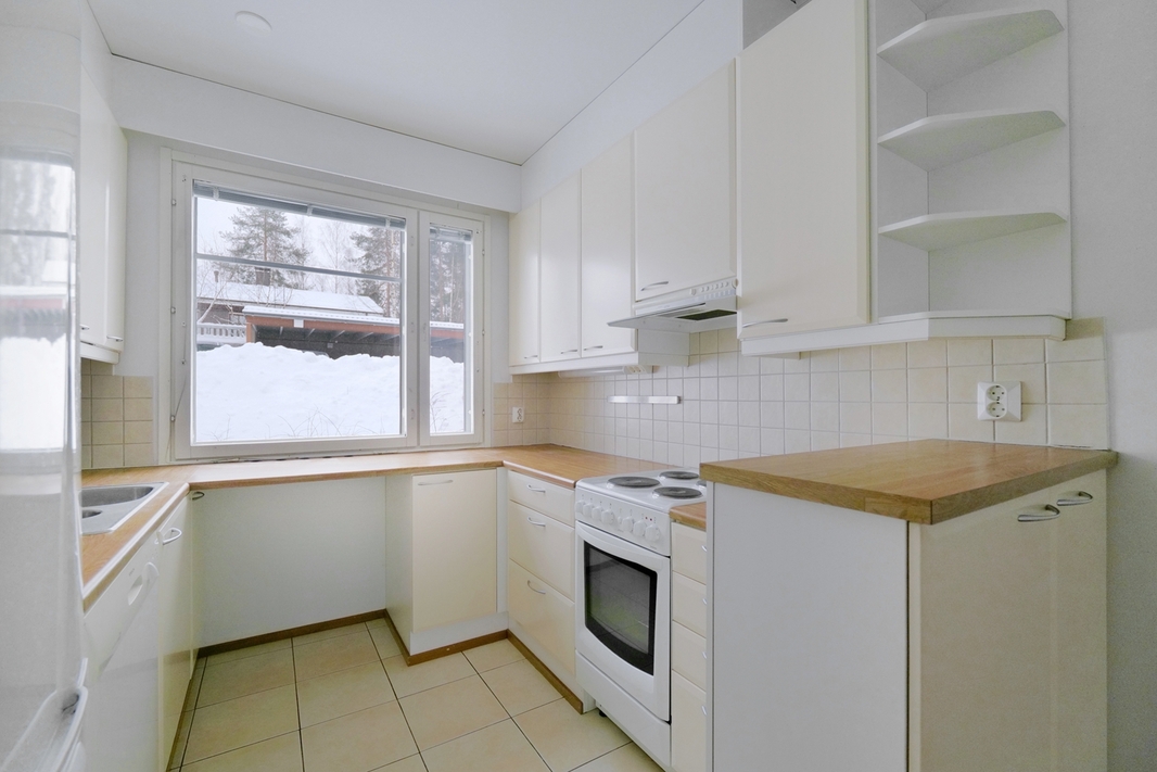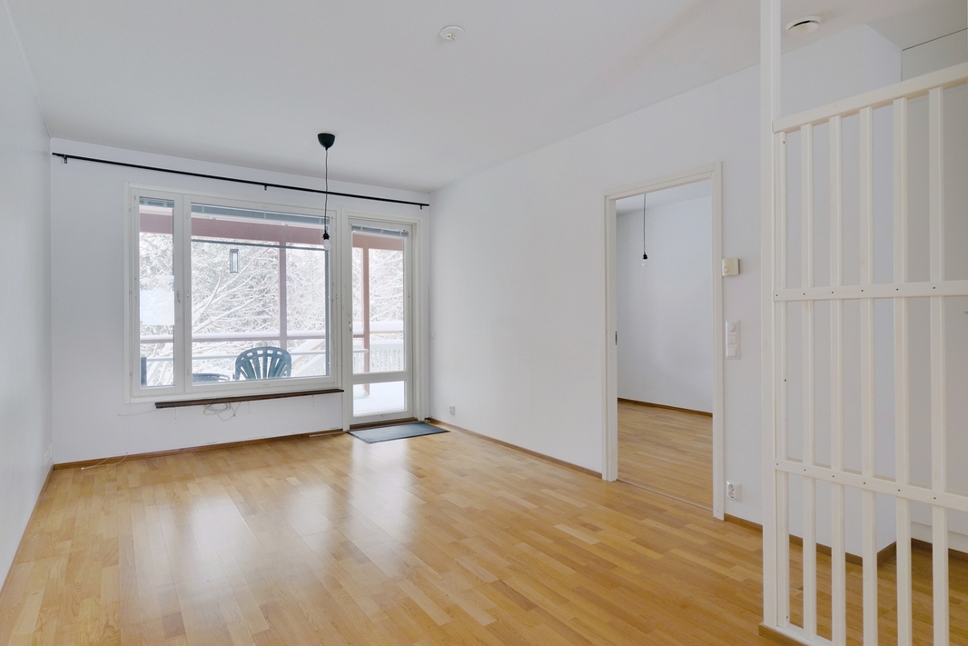 Olohuoneen yhteyteen saat ruokailutilan, joka erottuu niemekkeellä keittiöön. Kevyt rimoitus eteisen välillä ei tee asunnosta tukalan ahdasta. Makuuhuone ja sen yhteydessä säilytykseen vaatehuone. Tilava kylpyhuone, johon sijoittuu hyvin pyykinkäsittely ja sokerina pohjalla, se oma sauna. Eikä siinä vielä kaikki, kulkupeliä unohtamatta, jolle tarjolla autokatospaikka.