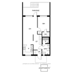 Yhdessä tasossa oleva rivitalohuoneisto, jossa koko huoneiston levyinen parveke / terassi ja portaita alas omalle piha-alueelle. Terassin alta löytyy kylmää säilytystilaa vaikka pihakalusteille.