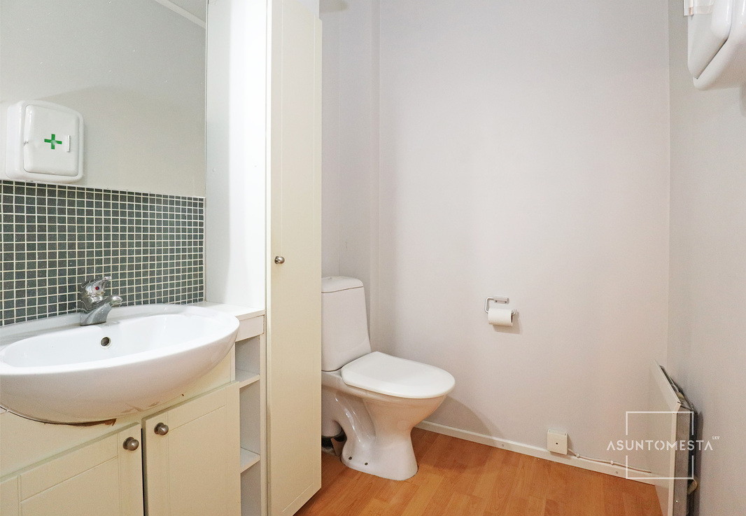 | WC-tilojen kuvaus | Pesuallas, allaskaappi, peili, wc-istuin. Lattia: laminaatti. Seinät: maalattu. |