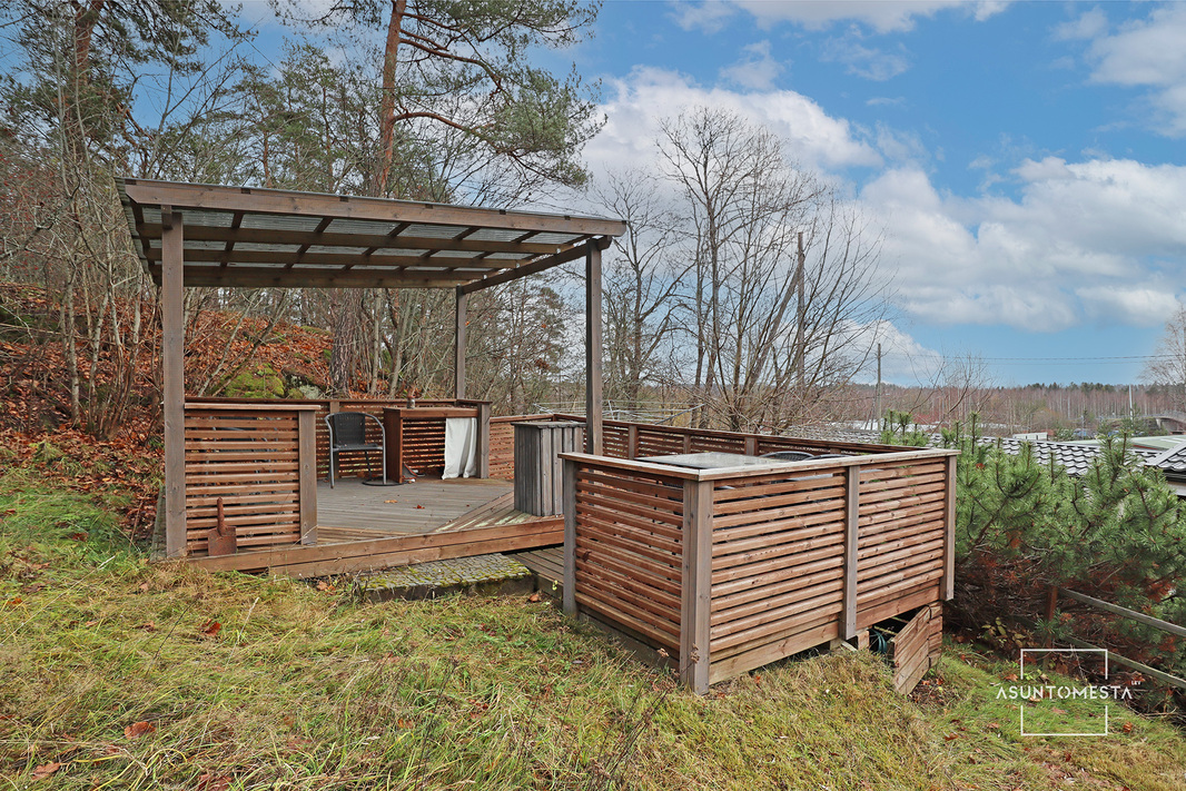 Kolmen makuuhuoneen koti, jossa on myös tilava olohuone, jonka neljä isoa ikkunaa tuovat mukavasti luonnonvalon sisään. Ilmalämpöpumppu ja takka hoitavat lämmitystä sähköpattereiden lisänä. Avoin keittiö on hyvin varusteltu ja laskutasoa ja kaappitilaa löytyy. Erillinen wc ja vieressä sauna ja kylpyhuone. Talon yhteydessä on myös autokatos ja runsaasti varastotilaa. Yläpihalla on mukava terassialue kesäiltojen viettoon.