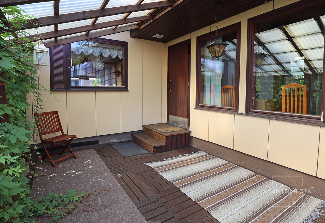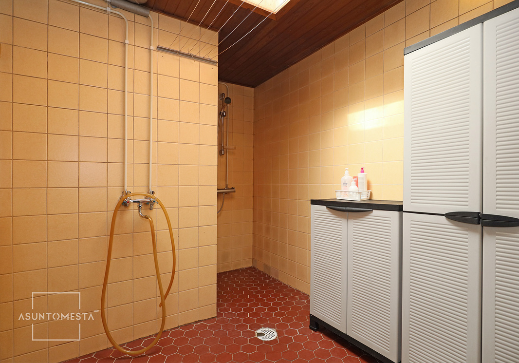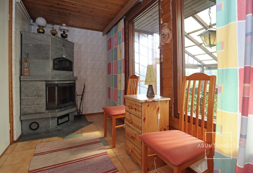 Talon siivessä on takkahuone, jossa takka/leivinuuni maukkaiden pataruokien ja paistosten tekemiseen. Tila toimii loistavasti myös pukuhuoneena saunaosastolle ja tilasta on käynti katetulle ja aidatulle terassille, sekä edelleen piha-alueelle.