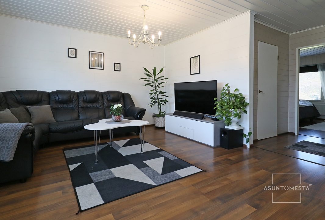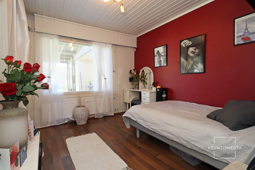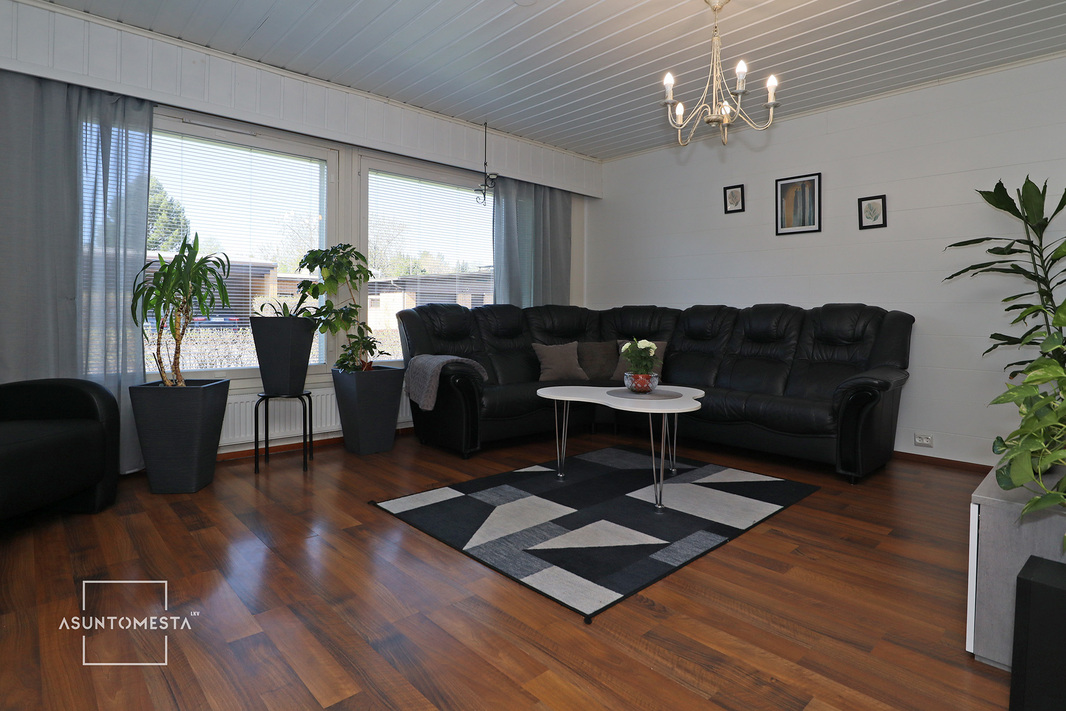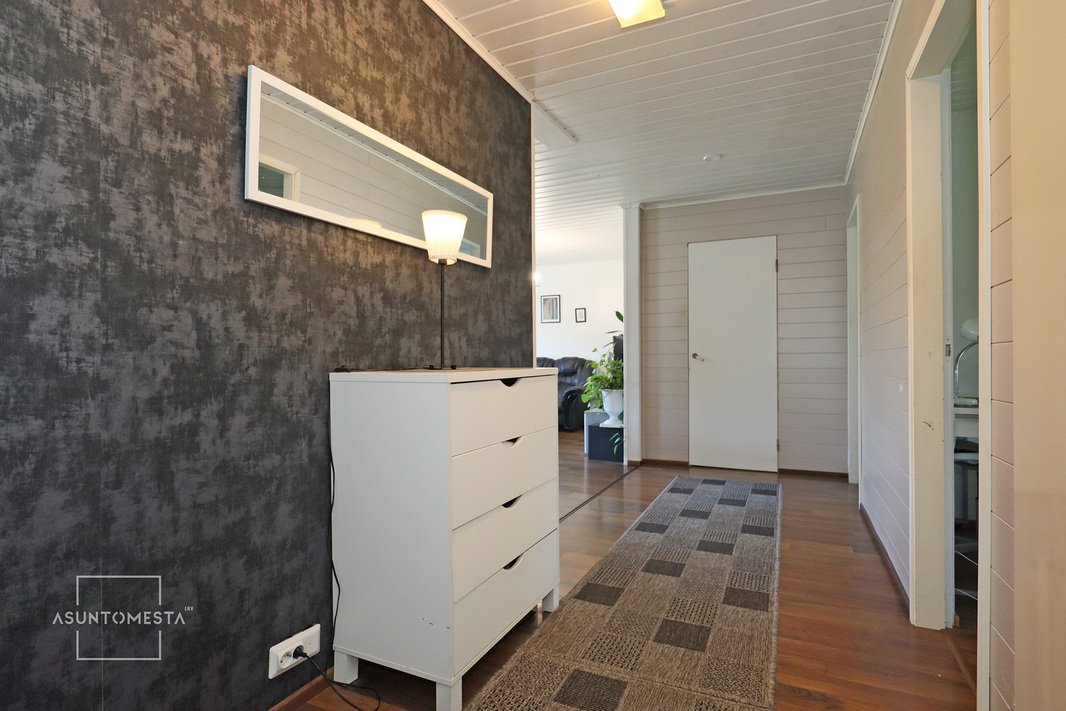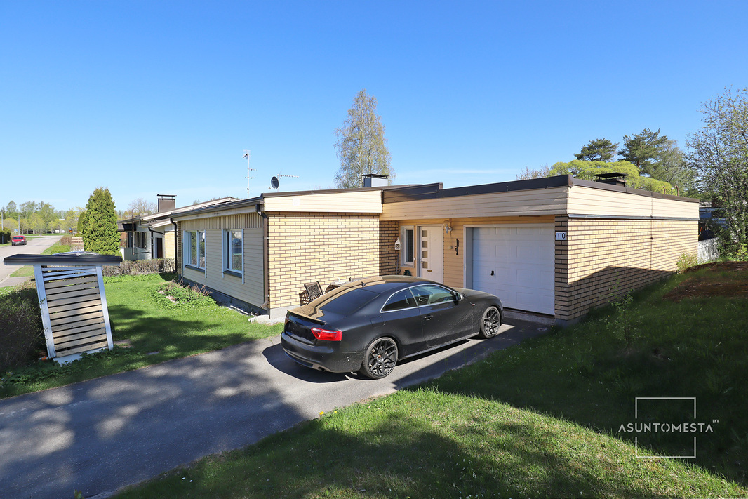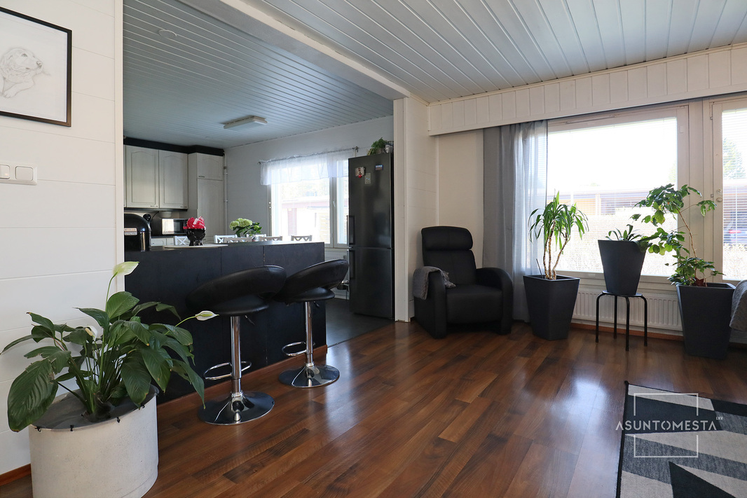 Keittiöstä on kaadettu seinä pois ja saatu nykyaikanen, avoin keittiö- ja olohuonetila, joka on ehdottomasti tämän kodin sydän. Kolme makuuhuonetta, joista saa pienellä pintaremontilla juuri omanväriset. Saunaosastolta on oma käynti suojaisalle terassille ja puutarhapiha on juuri sopivankokoinen, että sen jaksaa pitää mintissä! Plussana vielä monen toive: oma autotalli.