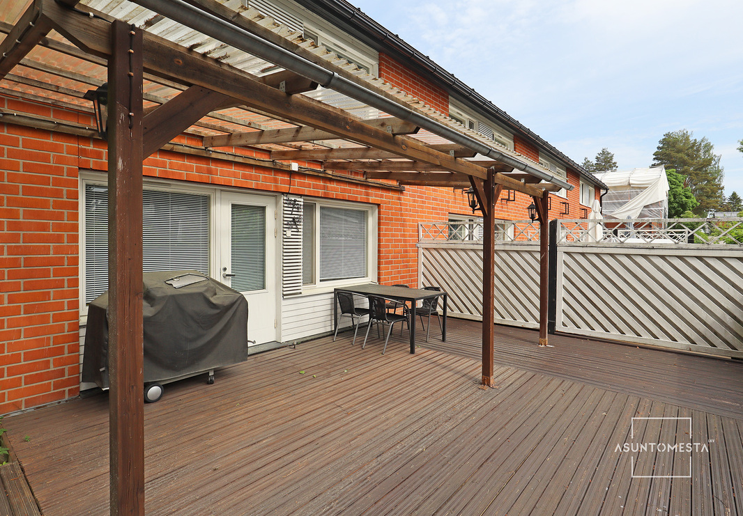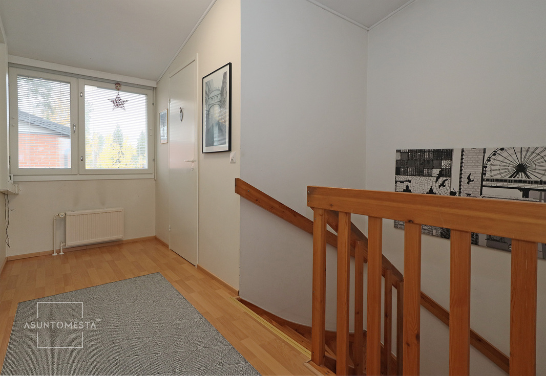 Huoneiston ensimmäiseen kerrokseen sijoittuu keittiö ja olohuone, josta käynti isolle, katetulle ja aidatulle terassille. Lisäksi erillinen wc ja tyylikäs saunaosasto sekä vaatehuone. Noustaan yläkertaan, jonka aulasta on käynti kolmeen makuuhuoneeseen ja erilliseen wc / kylpyhuoneeseen. Huoneiston sisäänkäynnin yhteydessä on varasto.
