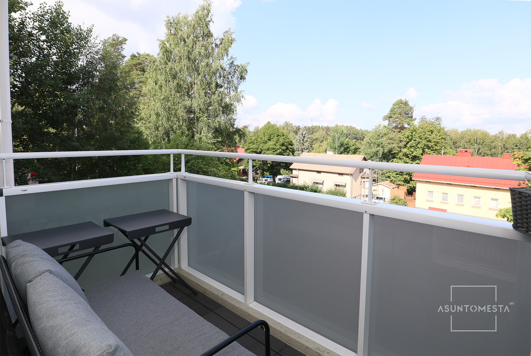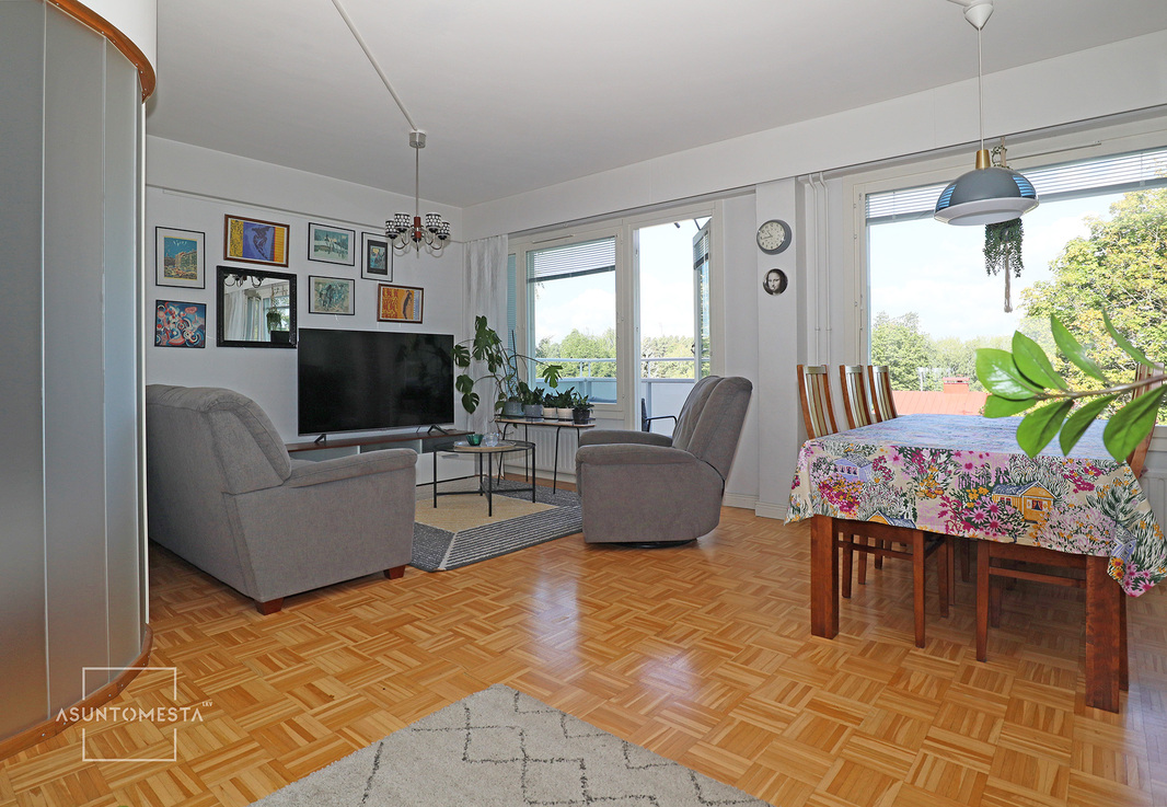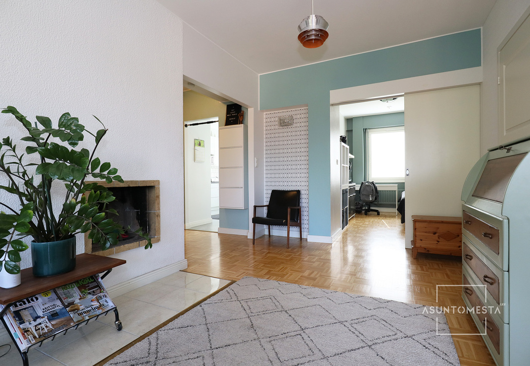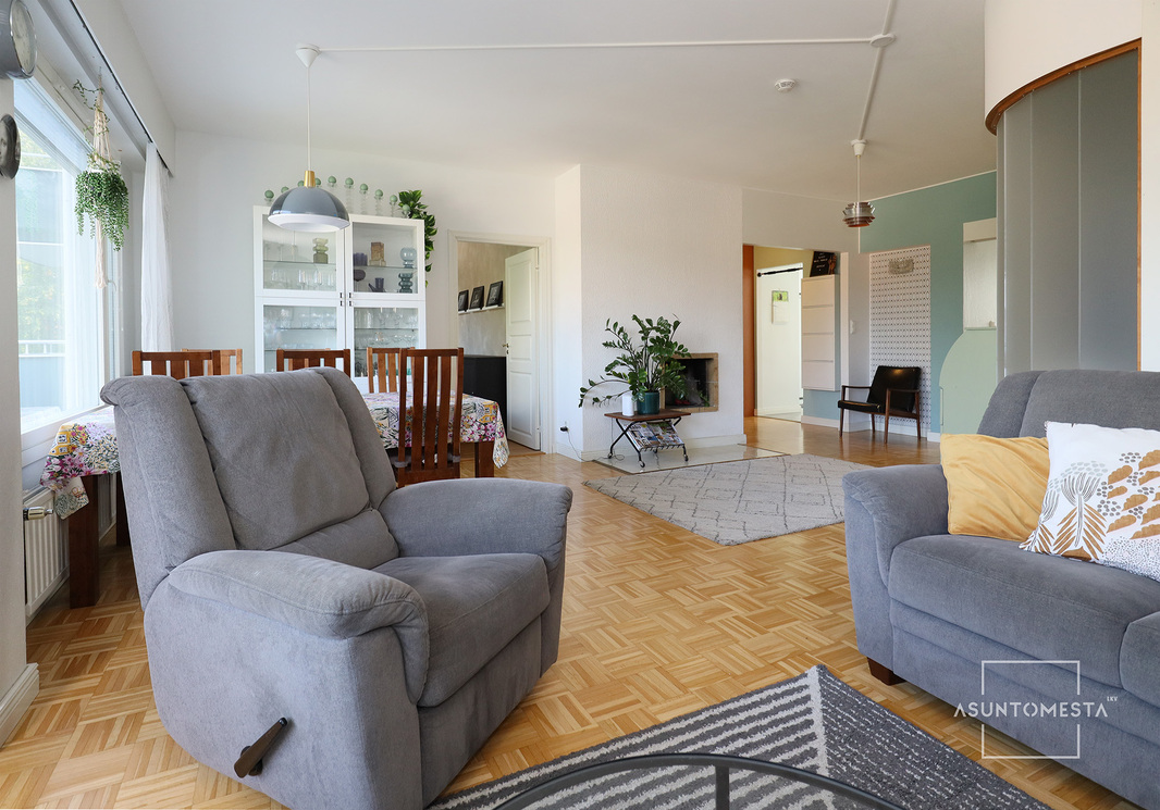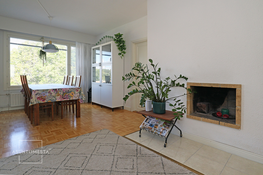 Vuosien kuluessa tämä asunto on kokenut muodonmuutoksia ja päivittynyt hienosti nykyaikaiseksi. Keittiö on tilava ja hyvin varustettu ja olohuoneessa on tilaa vielä myös juhlavampaan ruokailuun. Olohuoneen kaareva lasiseinä ja avotakka antavat oman lisäripauksen tyylin. Tämä asunto toimii täydellisesti vaikka etätyötä tekevälle tai muuten vaan keskustanläheistä asumista arvostavalle ja tilaa kaipaavalle.