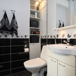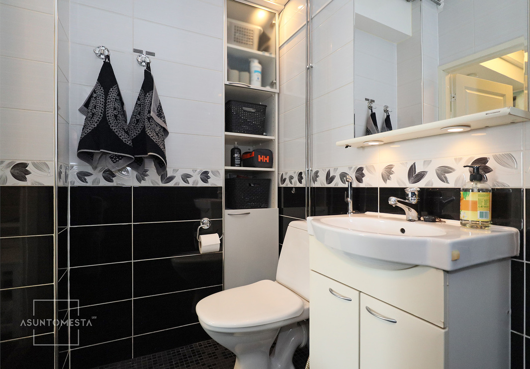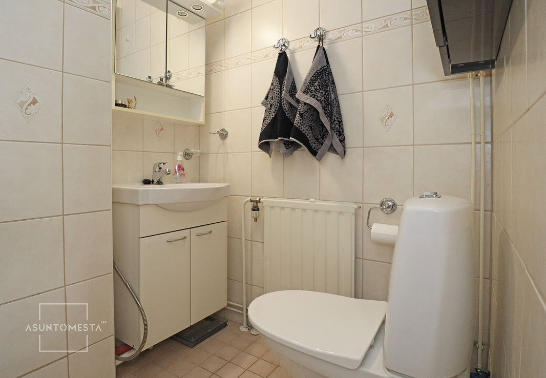 | Kylpyhuoneen kuvaus | Peili, jossa valaisimet, kaappi ja avohyllyt, naulakot, bidee-suihku, kuivuspatteri, |