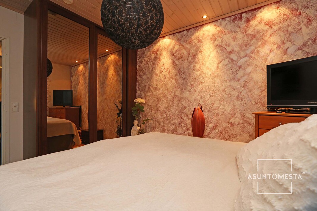 Pohjaratkaisussa on kivana yksityiskohtana yhden makuuhuoneen sijoittaminen talon siipeen takkahuoneen taakse, josta käynti terassille. Makuuhuoneessa liukuovellinen kaapisto.