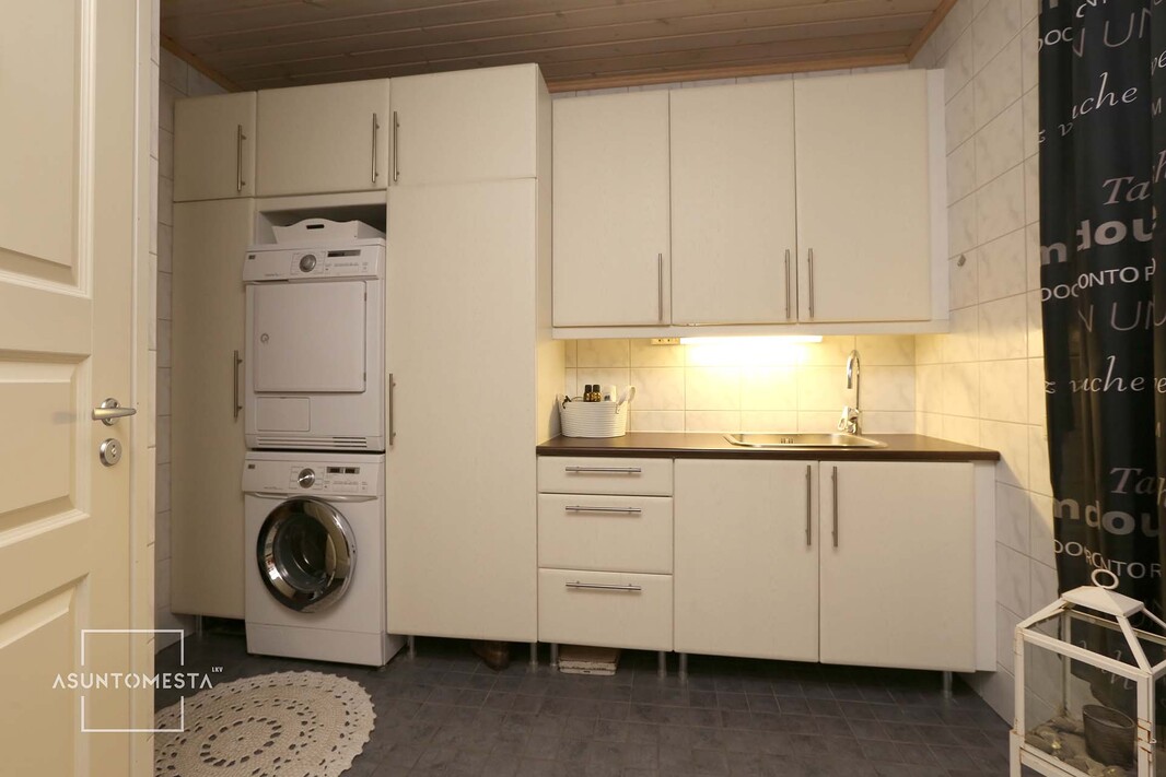 Kodinhoitohuoneesta on myös käynti ulos ja saunaosastolle, sekä toiseen wc:hen. Kahdessa muussa makuuhuoneessa on säilytystilaa kaapistoissa sekä toisen yhteydessä vielä vaatehuone. Erillinen keittiö ja iso olohuone sekä lisäksi autokatos ja varasto.