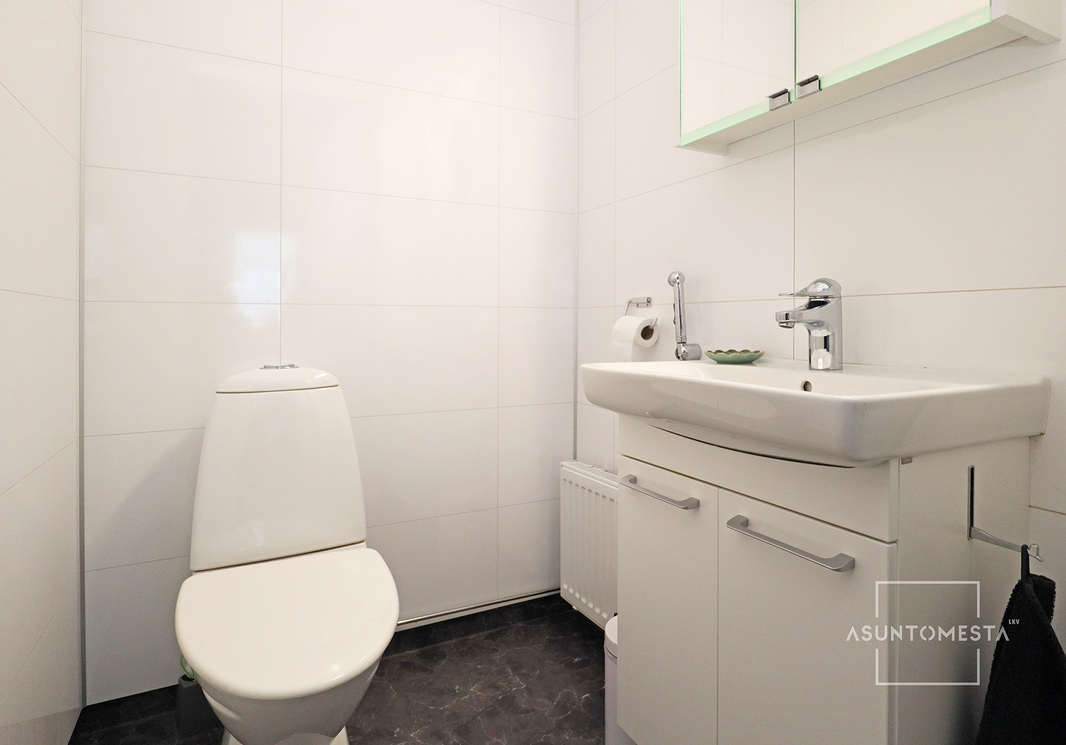 | WC-tilojen kuvaus | Peilikaappi, allaskaappi, pesuallas, bidee-suihku, wc. |