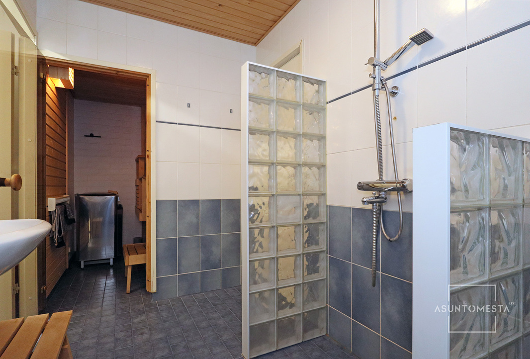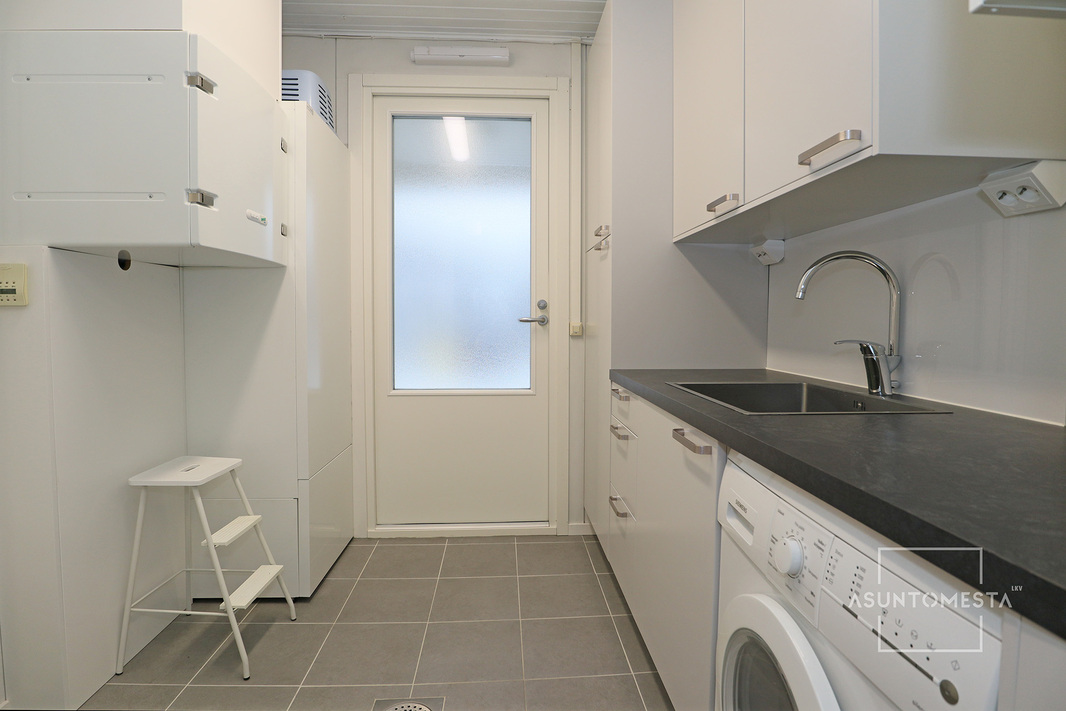 Keittiö ja kodinhoitohuone, josta on käynti suojaisan terassin kautta ulos. Sitten heti valmiilla kiukaalla varustettuun saunaan, johon on myös mahdollista vaihtaa puukiuas. Säilytystilaa on runsaasti vaatehuoneessa ja kaapistoissa, sekä autokatoksen yhteydessä olevissa varastoissa, joista toinen on lämmin. Eikä siinä vielä kaikki, keittiössä on puuhella ja leivinuunikin!