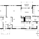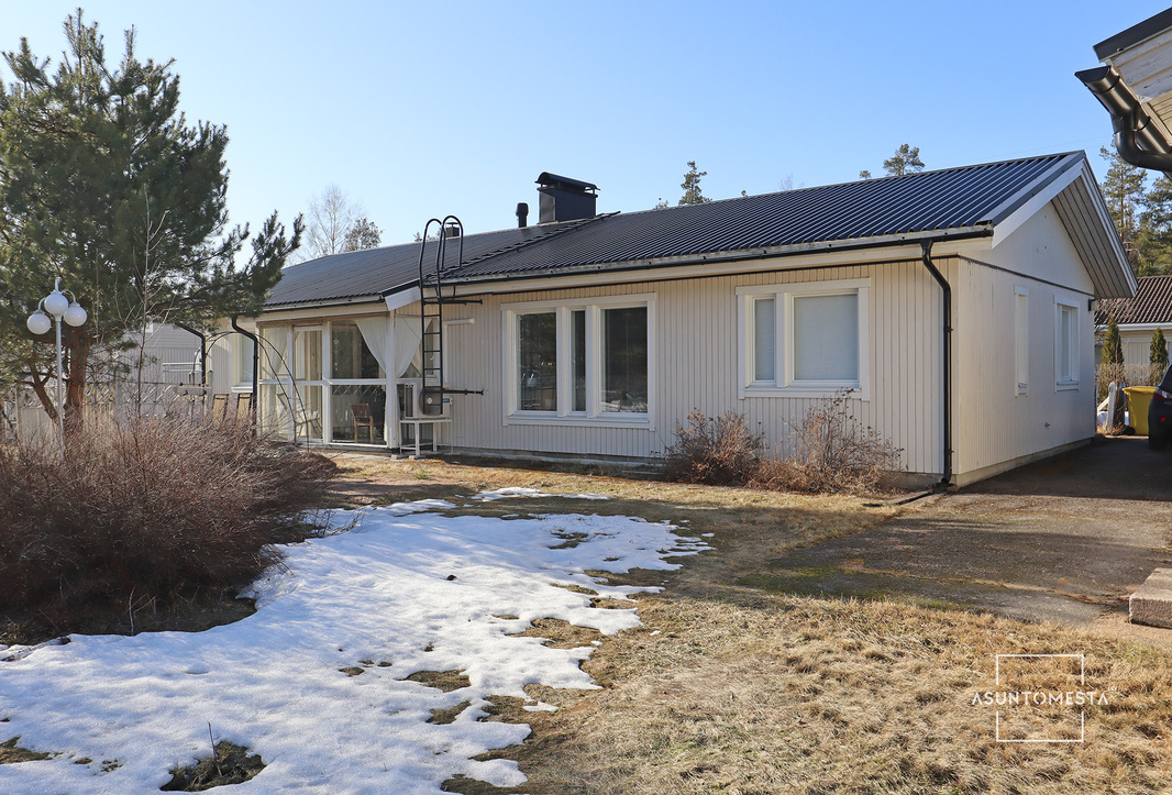 Joskus suunnittelija onnistuu luomaan pohjakuvan talolle, jossa jokainen neliö on hyötykäytetty. Tässä hyvin pidetyssä yksitasoisessa omakotitalossa on mm. makuuhuoneet sijoitettu eri puolille taloa. Avara olohuone yhdistyy ruokailutilaan. Samoin olohuoneesta takkahuoneeseen, joka muuntuu perheen omien tarpeiden mukaiseksi. Takkahuoneesta käynti lasitetulle terassille.