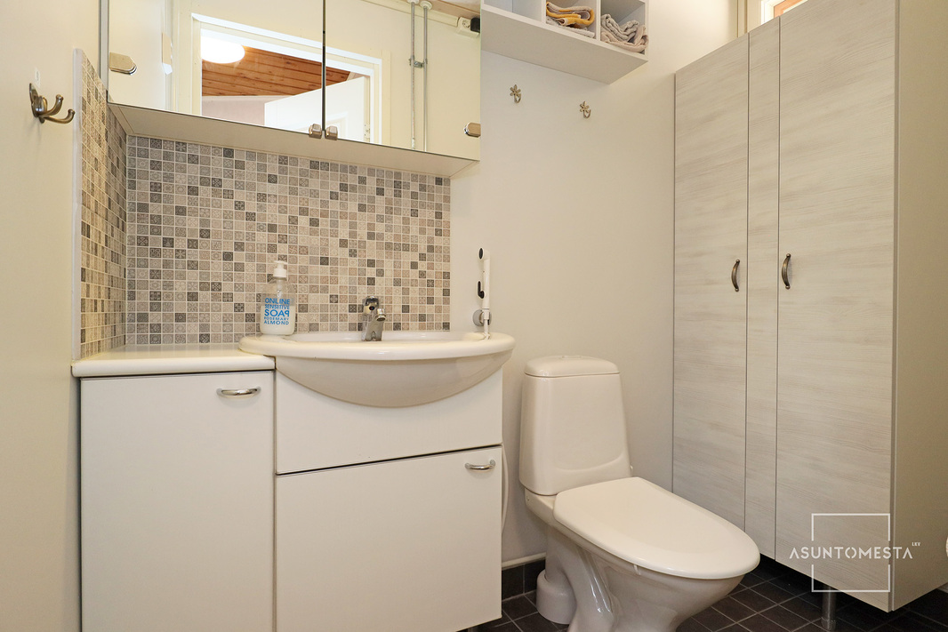 | WC-tilojen kuvaus | Kaksi erillistä wc:tä. Wc1: allaskaappi, peilikaappi, kaapisto, bidee-suihku, hyllykkö. Wc2: allaskaappi, peilikaappi, kaapistot, bidee-suihku, wc, kuivauspatteri, pesukoneliitäntä, lattiakaivo. |