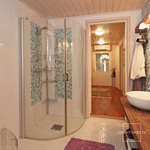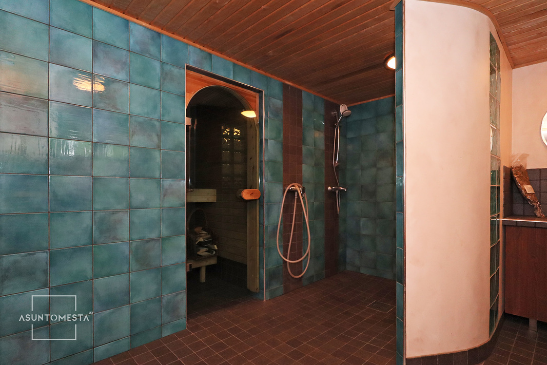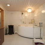 | Kylpyhuoneen kuvaus | Yläkerran spa-osastolla poreamme, pesuallas ja suihku. Keskikerroksessa suihku kaarevilla lasiovilla sekä pesuallas peileineen ja kaappeineen. Alakerrassa saunaosasto. |