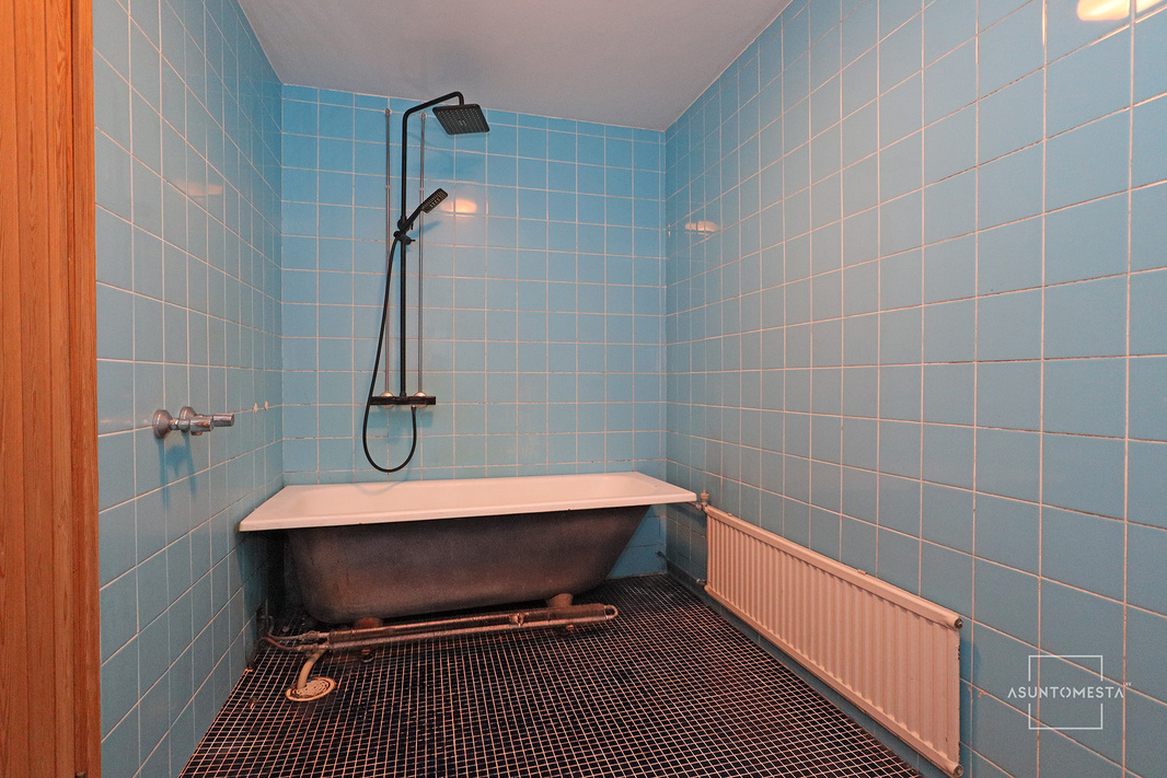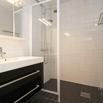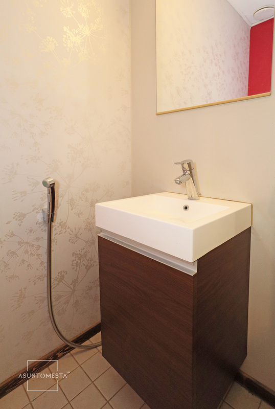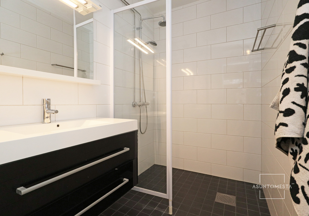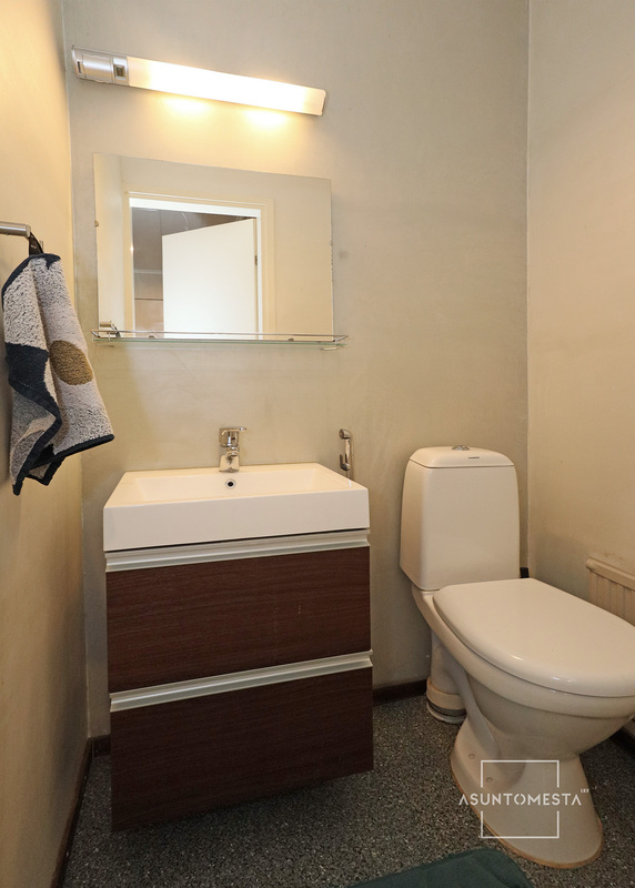 | Kylpyhuoneen kuvaus | Yläkerrassa vuonna 2016 remontoitu erillinen kylpyhuone: sadesuihku ja käsisuihku, suihkuseinä, pyyheteline, pesuallas ja allalaatikosto, peili, lattialämmitys (sähköllä), naulakot. Lattia ja seinät laattaa. Alakerrassa saunaosastolla kylpyhuone, jossa suihku ja kylpyamme. Lattiat ja seinät laattaa. |