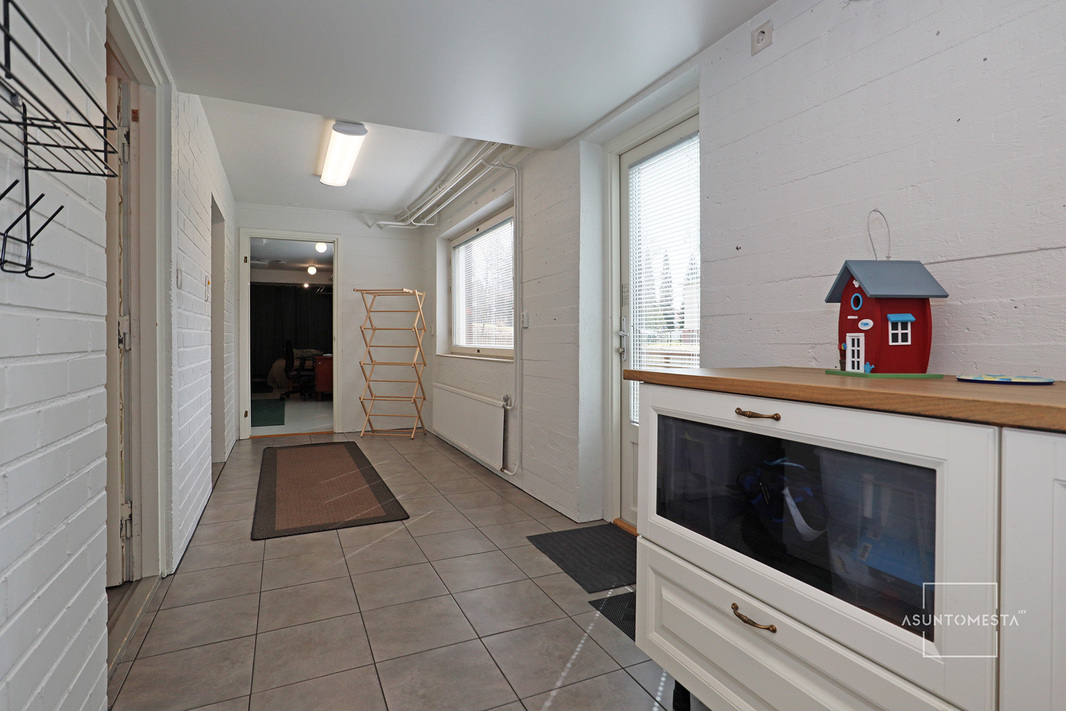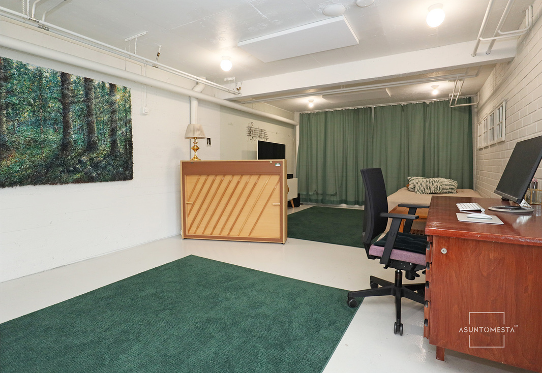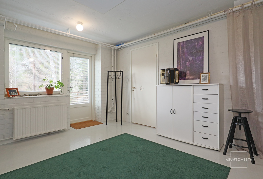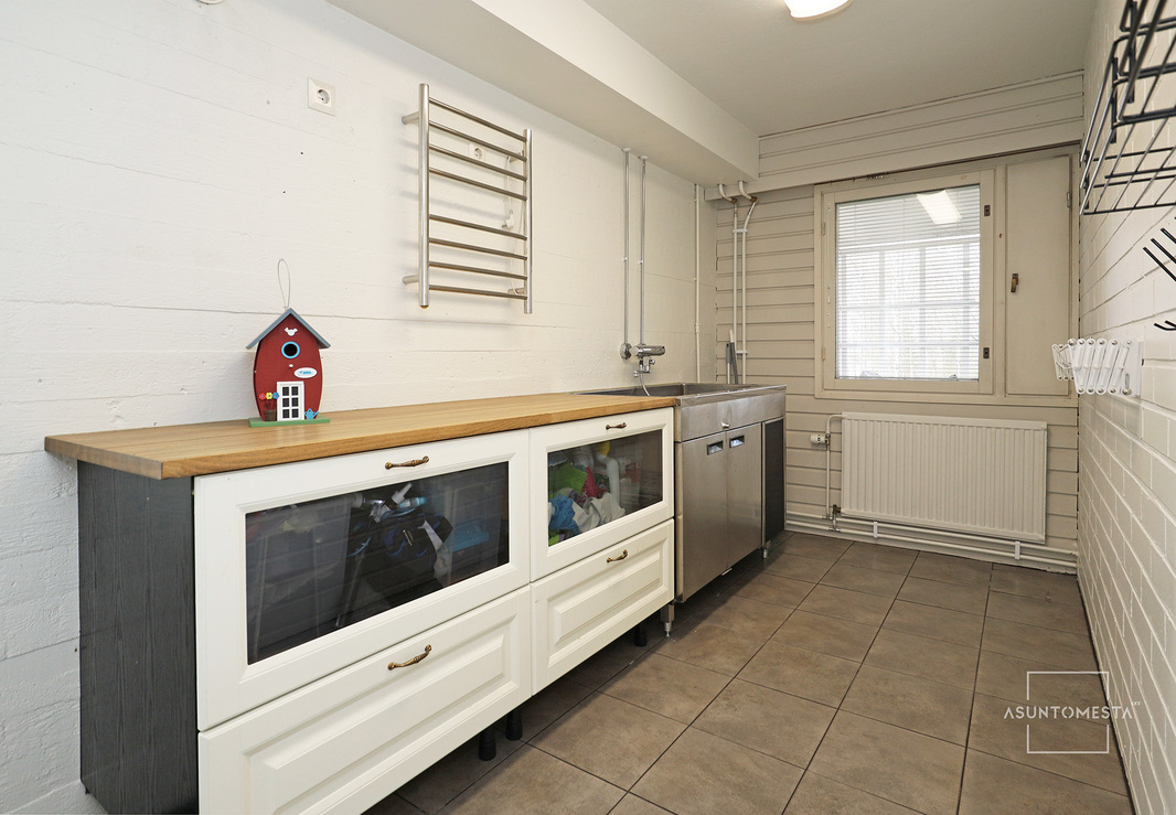 Alakerrassa on hulppean kokoinen harrastetila, jonka käyttömahdollisuuksissa on vain mielikuvitus rajana. Saunaosaston yhteydessä on leivinuunilla varustettu tunnelmallinen takkahuone/pukuhuone ja vielä yksi wc. Kodinhoidollekin on erinomaiset tilat ja kaikki perheen pienimmät ja karvaisetkin saa tuotua alakerran ovesta sisään ja suoraan huuhdeltavaksi. Pappilan vanha arkistohuone toimii valtavana lämpimänä varastotilana ja lisää säilytystilaa on vaatehuoneissa ja ulkovarastossa. Ja autotalli toki löytyy myös. Oma tontti on lähes puolen hehtaarin kokoinen, osin aidattu.